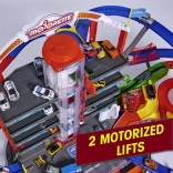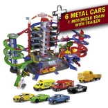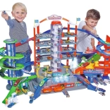 Duży garaż do zabawy o szerokości prawie 1,30 m to największy nowy produkt w świecie Majorette! Garaż składa się z siedmiu stref zabaw i oferuje aż 35 miejsc parkingowych i magazynowych. Sercem stacji jest zmotoryzowana spiralna winda, która jednocześnie przewozi do dziewięciu metalowych autek. Po dotarciu na górę automatyczne przełączniki rozdzielają pojazdy na cztery różne pasy ruchu. Sześć różnych efektów świetlnych i dźwiękowych, a także niezliczone strefy zabawy, takie jak stacja kolejowa, stacja paliw z dystrybutorem, serwis samochodowy i myjnia, remiza strażacka, komisariat policji z tajną kryjówką czy lądowisko dla helikopterów, zapewniają nieograniczoną zabawę. W zestawie znajduje się 6 metalowych autek, pociąg zasilany bateriami, automatyczne rozjazdy, tunel z funkcją kraksy oraz 2 zmotoryzowane windy. Śmigłowiec nie wchodzi w skład zestawu. Wymiary po złożeniu: 128 x 78 x 73 cm.