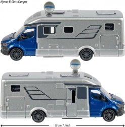 Model jest oficjalnie licencjonowany przez marki HYMER i MERCEDES-BENZ i oferuje atrakcyjne połączenie oświetlenia wewnętrznego i zewnętrznego oraz 2 realistycznych dźwięków – odgłosów przyrody i silnika – aktywowanych naciśnięciem maski. Otwierane drzwi, obrotowa antena satelitarna oraz opony z bieżnikiem zapewniają płynną jazdę i mnóstwo scenariuszy zabawy w domu i w podróży.