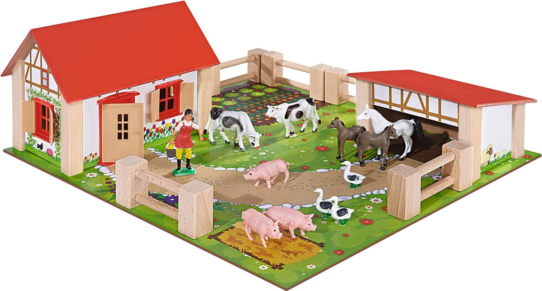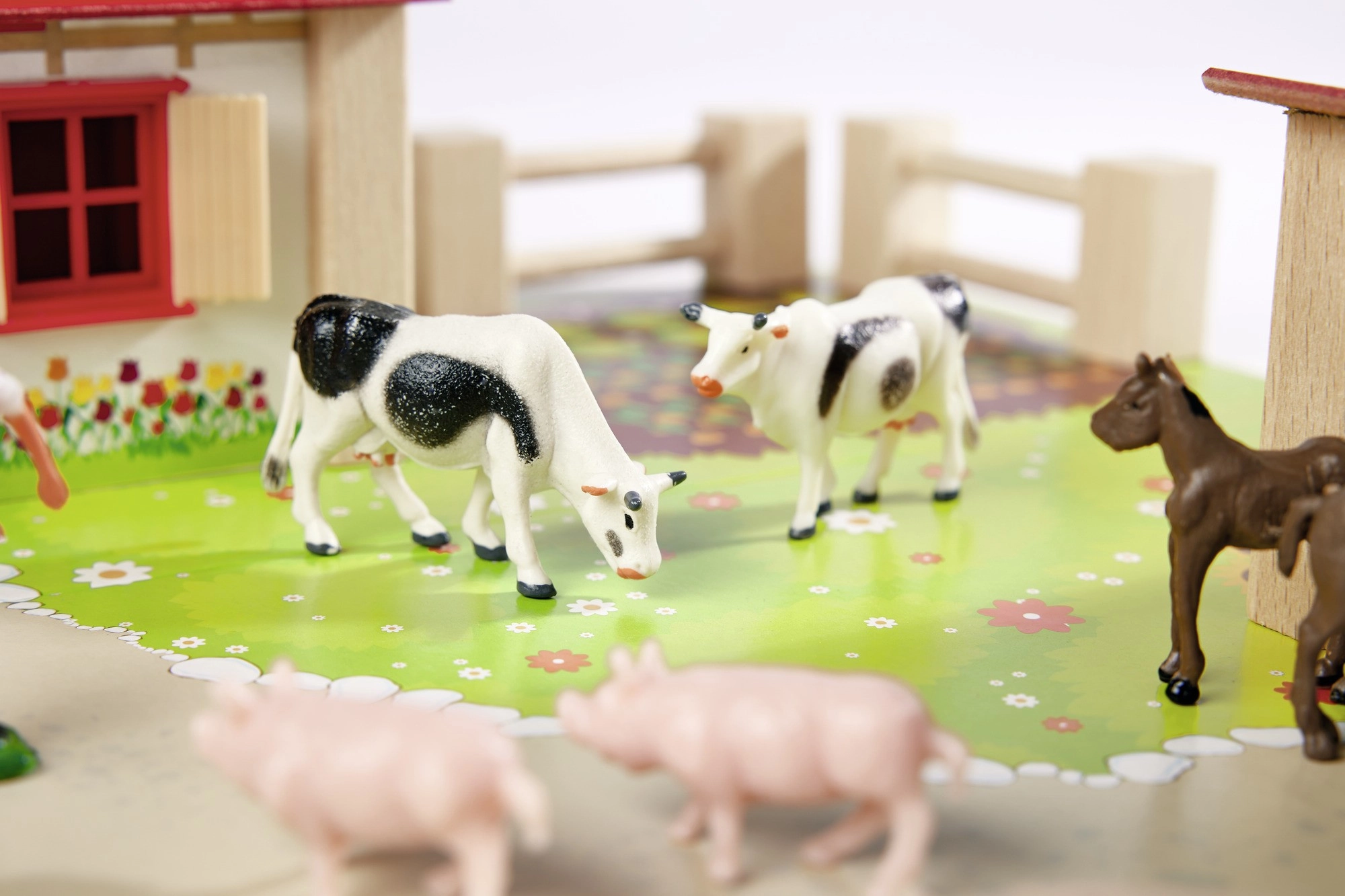 Domek z otwieranymi drzwiami i oknami oraz przestronna stajnia stanowią serce farmy. Drewno nadaje zestawowi trwałość i autentyczny wygląd na długie godziny zabawy.