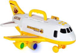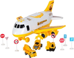 W zestawie znajdują się trzy żółte pojazdy budowlane – koparka z ruchomym ramieniem, betoniarka i spychacz – oraz 7 znaków drogowych. Wszystko mieści się wewnątrz samolotu. Zabawka ma odpinane skrzydła dla oszczędności miejsca oraz rączkę ułatwiającą przenoszenie.
