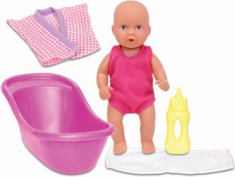Lalka pije i siusia to idealna zabawka dla małych rodziców. Zestaw zawiera akcesoria do kąpieli, w tym butelkę, wanienkę, ręcznik i szlafroczek.