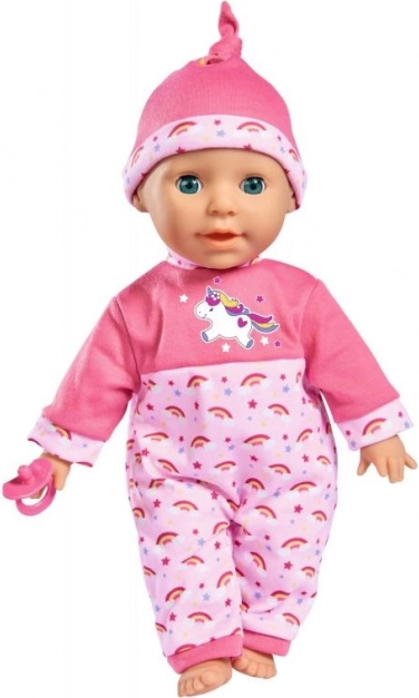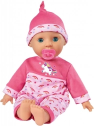 Lalka jest ubrana w różowy strój z motywem jednorożca, co czyni ją uroczym obiektem zabaw dla dzieci.