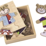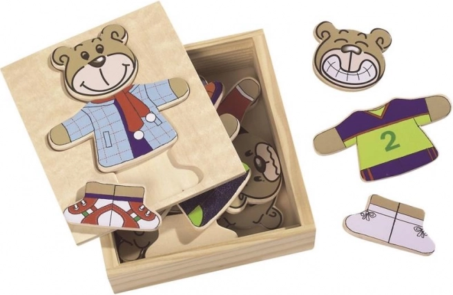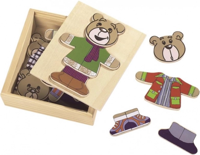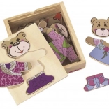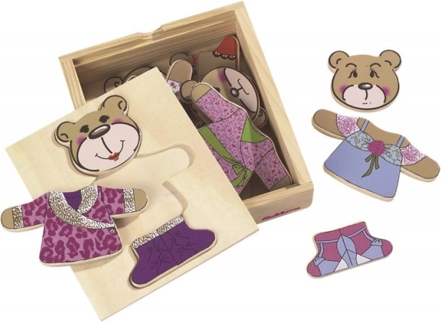 Ubierz swojego misia przy pomocy tej zabawnej układanki! Zawiera 20 części i przychodzi w praktycznym drewnianym pudełku.