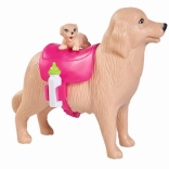 Różowe nosidełko na psie mieści szczenięta i buteleczkę, co wprowadza nowe scenariusze i interaktywne elementy zabawy.