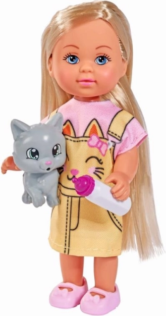 Urocza laleczka Evi Love w sukience z nadrukiem kotka ucieszy wszystkich małych miłośników zwierząt. W zestawie znajduje się figurka kotka oraz butelka do karmienia do zabawy w opiekę. Dwa różne wyglądy – wysyłamy losowo, cena dotyczy 1 sztuki.
