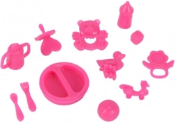 Zestaw zawiera różne różowe zabawki z plastiku, takie jak talerz, sztućce i butelka, które wzbogacają doświadczenie zabawy.