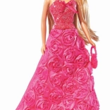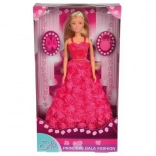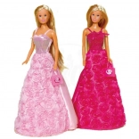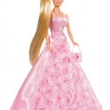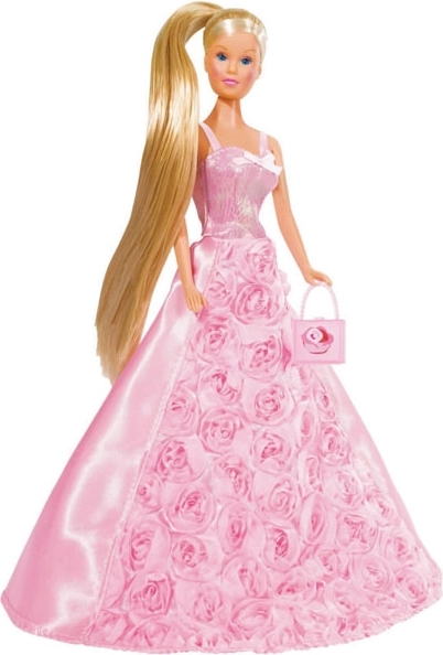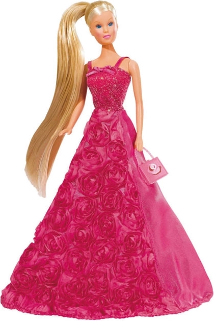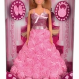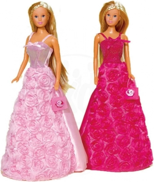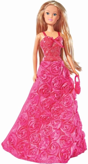 Lalka Steffi ma na sobie pięknie dopracowaną suknię z różanymi, kwiatowymi motywami.
