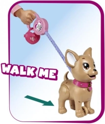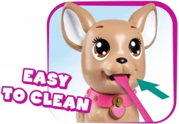 Uroczy interaktywny piesek chihuahua z kolekcji CHI CHI LOVE uczy dzieci opieki nad pupilem w zabawny sposób. Nakarm go masą plastyczną, wybierz się na spacer, a po lekkim naciśnięciu smyczy zrobi kupkę. W zestawie znajduje się smycz, masa plastyczna, foremka oraz pudełeczko w kształcie serca z woreczkami do łatwego sprzątania. Wielkość pieska to około 20 cm.