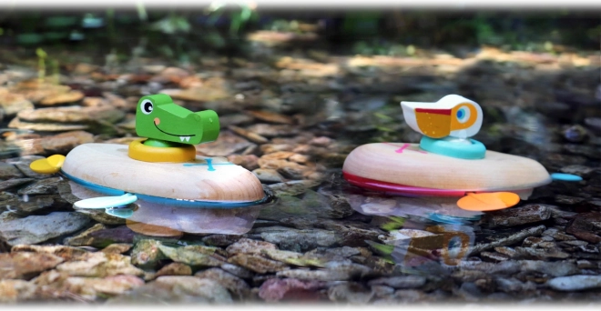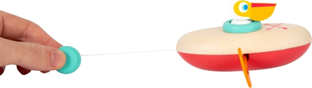 Wystarczy nakręcić i patrzeć, jak boczne wiosła się obracają, a pelikan wypływa. Świetny sposób, aby zapoznać dzieci z zasadą przyczyny i skutku.