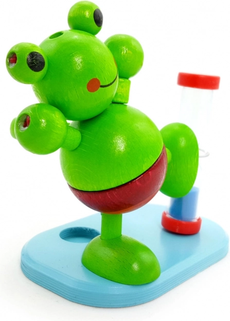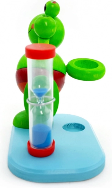 Umilcie dzieciom codzienną higienę dzięki tej wesołej drewnianej klepsydrze w kształcie żaby. Idealna do odmierzania 2 minut szczotkowania zębów, z praktycznym uchwytem na szczoteczkę do zębów za postacią żaby. Wysokiej jakości wykonanie z naturalnego, nieimpregnowanego drewna oraz atrakcyjny design motywują do regularnego mycia zębów.