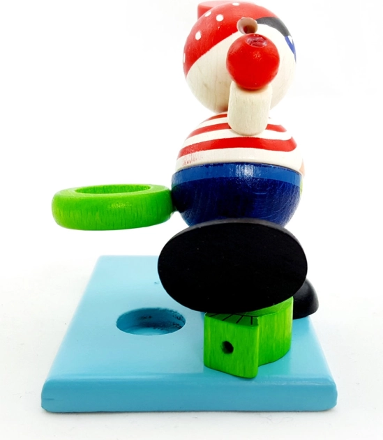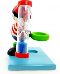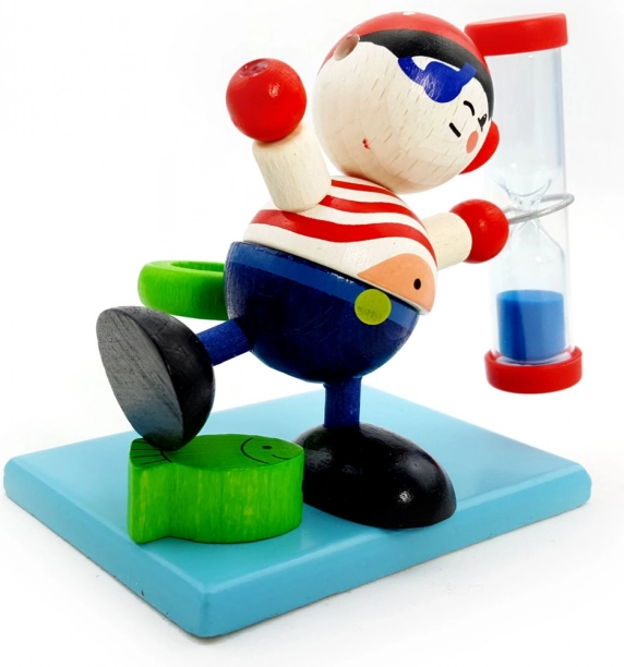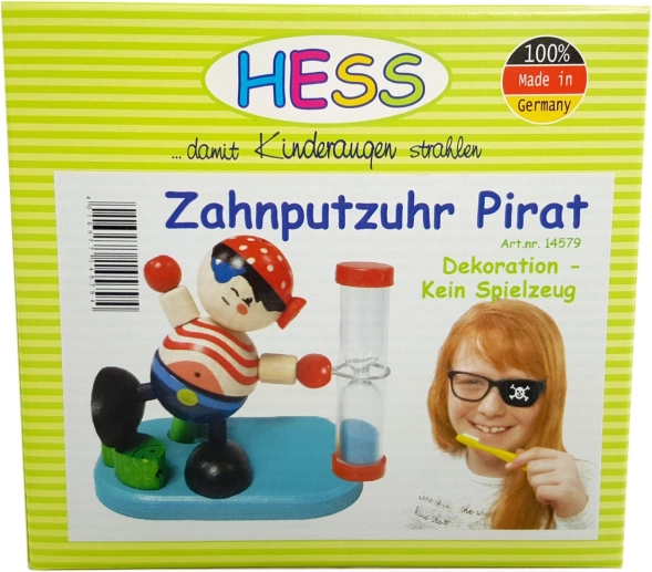 Motywuj dzieci do regularnego mycia zębów poprzez zabawę. Drewniany pirat z klepsydrą z niebieskim piaskiem niezawodnie odmierza zalecane 2 minuty, a zintegrowany uchwyt na szczoteczkę do zębów pomaga utrzymać porządek w łazience.