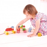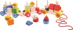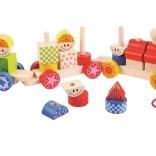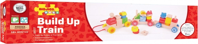 Trzy połączone wagoniki i 28 klocków do nakładania oferują dziesiątki kombinacji. Dzieci ćwiczą sortowanie kolorów i kształtów, motorykę małą oraz wyobraźnię.