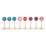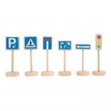 Zestaw 25 drewnianych znaków drogowych i akcesoriów (np. pachołków) pomaga dzieciom zrozumieć zasady ruchu drogowego w realistycznych scenariuszach zabaw. Dzięki czytelnym symbolom i stabilnym podstawkom są wygodne w użytkowaniu i stanowią świetne uzupełnienie dywanów z drogami oraz torów kolejowych.