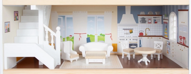 Domek dla lalek ma jasną zewnętrzną fasadę, nowoczesny design i funkcjonalne elementy, takie jak przesuwne drzwi i otwierane okna.