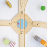 Wszystkie elementy wykonano z trwałego i zrównoważonego drewna kauczukowego, malowanego nietoksycznymi farbami na bazie wody. Kolejka wspiera rozwój motoryki małej, wyobraźnię oraz jest kompatybilna z innymi kolejkami dostępnymi na rynku.