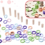 Dziesięć kołków i zestaw kolorowych krążków pomagają zrozumieć pojęcie ilości. Liczba krążków na kołku odpowiada cyfrze na podstawie – prosta i obrazowa nauka pierwszego liczenia.