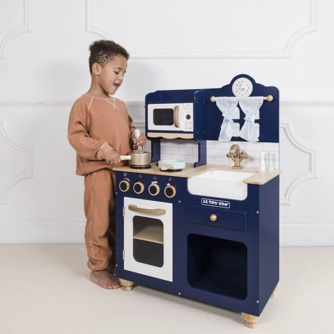 Stylowa dziecięca kuchnia z wysokiej jakości drewna w odcieniu królewskiego granatu ze złocistymi akcentami zapewnia dzieciom godziny kreatywnej i wyobrażeniowej zabawy. Oferuje otwierany piekarnik, obrotowe pokrętła, zlew, mikrofalówkę, urocze okienko z zasłonkami oraz zegar z ruchomymi wskazówkami. W zestawie znajdują się drewniane akcesoria – trzepaczka, łyżka kuchenna, solniczka i pieprzniczka. Wykonana etycznie z zrównoważonego drewna i malowana nietoksycznymi farbami na bazie wody.