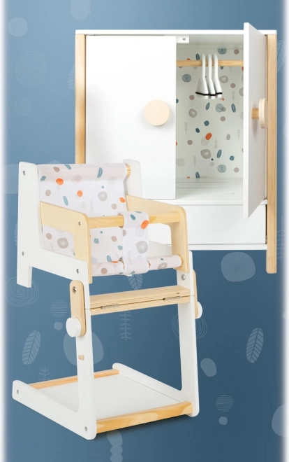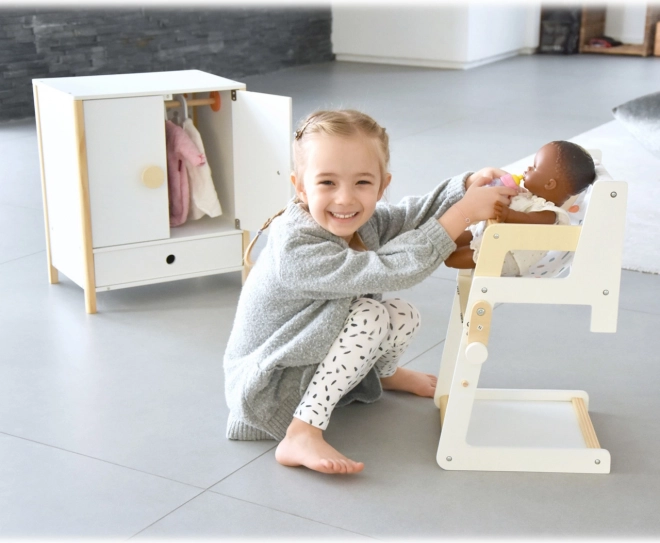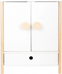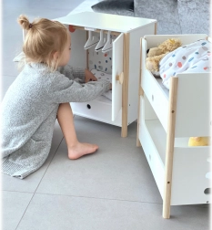 Trwała drewniana konstrukcja, stabilne wykonanie i bezpieczne, zaokrąglone krawędzie zapewniają wygodną i bezpieczną zabawę. Szafka wspiera samodzielność, poczucie porządku i rozwija wyobraźnię podczas zabawy w opiekę nad lalkami.