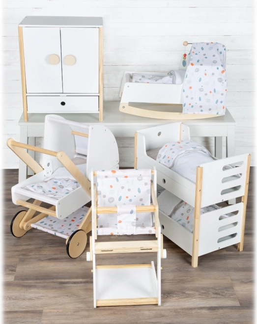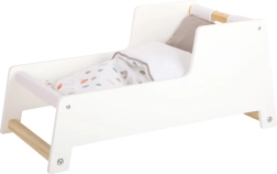 Stylowa kołyska dla lalek w stylu nordyckim dla dzieci od 3 lat. Oferuje stabilną drewnianą konstrukcję, płozy bujane, łatwo zdejmowany baldachim oraz dwustronną, neutralną płciowo pościel. Pod dużą kołdrą wygodnie wyśpią się lalki i pluszaki do 46 cm. Eleganckie pastelowe tony i zaokrąglone krawędzie doskonale wpasują się w nowoczesny pokój dziecięcy.