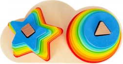 Wieża nakładkowa Tęcza Duo to drewniana zabawka zaprojektowana do wspierania nauki i rozwoju dzieci. Oferuje możliwość uporządkowania elementów według wielkości i kształtu - gwiazdek i kółek - w promiennym kolorowym wykonaniu. Ta zabawka stymuluje rozpoznawanie kolorów i zdolności koordynacyjne, podczas gdy dzieci bawią się układając tęczę.