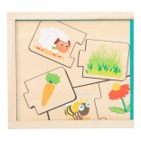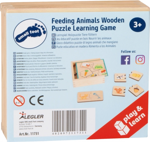 Ucz się i baw się z tą drewnianą grą logiczną, która nauczy twoje dziecko, jakie zwierzę co je. Puzzle, memory i gra w pary w jednym opakowaniu.
