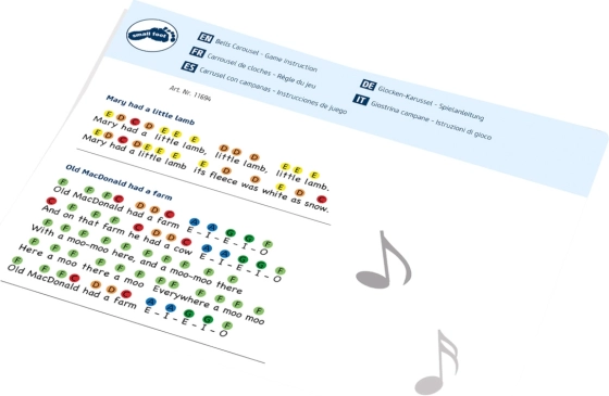 W zestawie znajdują się zapisy nutowe z kolorowymi oznaczeniami i ulubionymi dziecięcymi piosenkami, aby szybko zacząć grać.