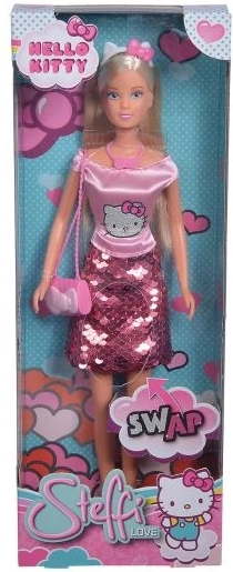 Lalka Steffi Hello Kitty oferuje modny strój z cekinową spódniczką i efektem zmiany (swap), który zachwyci każdego małego miłośnika mody. W zestawie są także akcesoria, takie jak naszyjnik, opaska i mała torebka, podkreślające jej zabawny charakter.