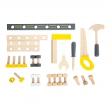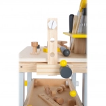 Kompaktowy drewniany dziecięcy stół warsztatowy stanie się idealnym towarzyszem dla małych majsterkowiczów. Zawiera różne narzędzia, takie jak piła, imadło i śrubokręty oraz pozwala dzieciom rozwijać ich umiejętności motoryczne i kreatywność.