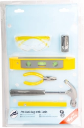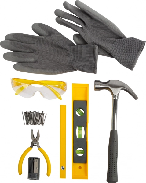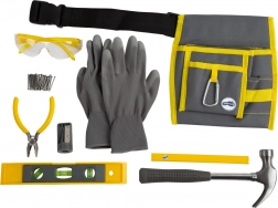 - Torba/pas na narzędzia, młotek, kombinerki, rękawice robocze (rozm. 7), poziomica z magnesem, gogle ochronne, karabińczyk, ołówek, temperówka, gwoździe