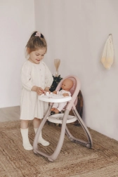 Wysokie krzesełko zawiera stolik z zabawką do zabawnego karmienia lalek.