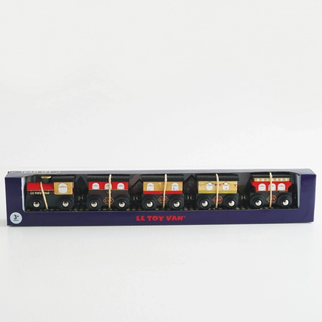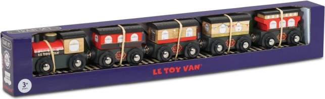 Stylowy drewniany pociąg ROYAL EXPRESS od Le Toy Van ucieszy dzieci i rodziców. Zawiera lokomotywę i pięć wagonów z magnetycznym łączeniem, wykonany jest z zrównoważonego drewna i malowany nietoksycznymi farbami na bazie wody. Wspiera małą motorykę, zabawy wyobrażeniowe i jest kompatybilny z większością drewnianych kolejek.
