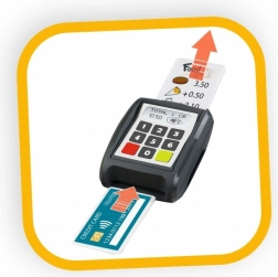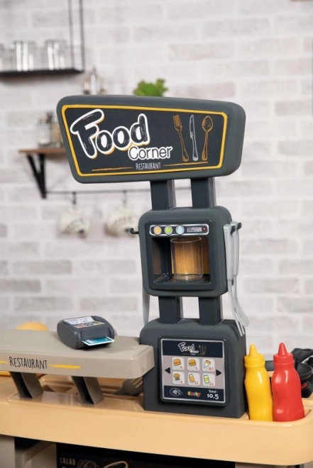 Część kuchenna do przygotowywania posiłków oraz lada wydawcza z kasą i terminalem płatniczym wspierają realistyczną zabawę w restaurację.