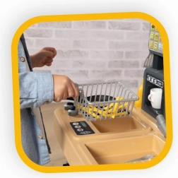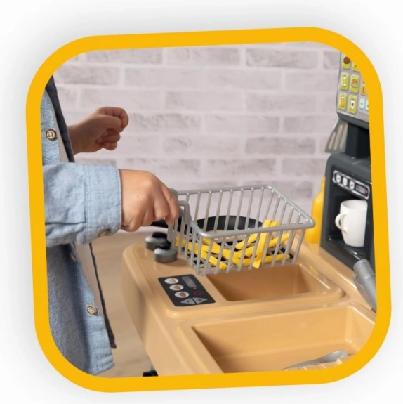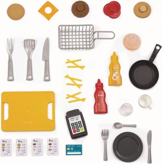 Zestaw zachwyca licznymi detalami: płyta grzewcza, frytkownica, zlew z kranem, piekarnik, lodówka, dozownik napojów, ekspres do kawy oraz haki do zawieszania akcesoriów. Nie brakuje terminala płatniczego, paragonów, karty kredytowej ani drukowanego menu. Po zabawie resztki można „wyrzucić” do kosza. Łącznie 29 dodatków wspiera bogate scenariusze odgrywania ról i rozwój małej motoryki.