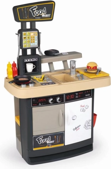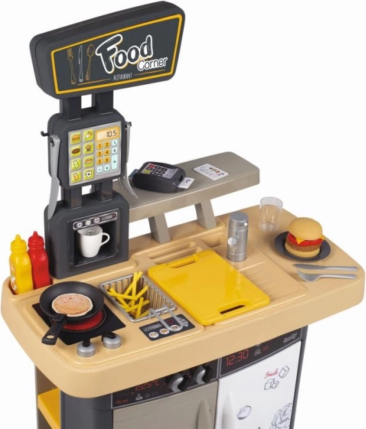 Otwórz własny mały fast food! Dziecięcy Food Corner 2w1 marki Smoby łączy kuchnię i ladę wydawczą z kasą. Dzieci mogą przygotowywać burgery, frytki czy naleśniki i jednocześnie obsługiwać klientów przy ladzie – zupełnie jak w prawdziwej restauracji.