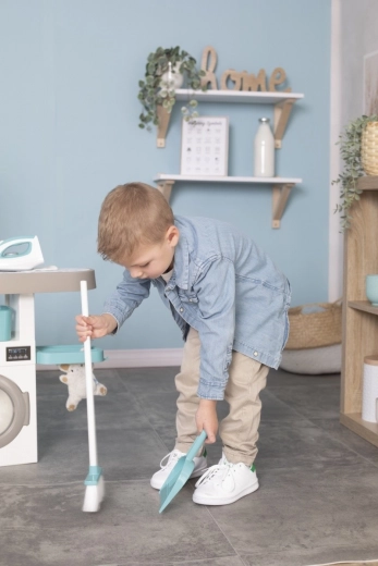 Pralkę z otwieranymi drzwiczkami i szufladą na detergent uzupełnia deska do prasowania z mechanicznym żelazkiem, suszak oraz kosz na pranie – kompletna pielęgnacja ubrań w dziecięcym rozmiarze.