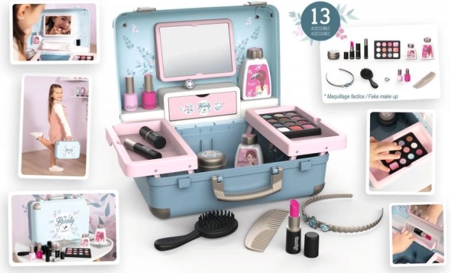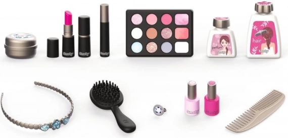 Odkryj magię zabawy w salon piękności z kosmetyczną walizeczką My Beauty Vanity. Ta piękna i funkcjonalna walizeczka zawiera 13 replik kosmetyków, takich jak szminki, lakiery do paznokci, cienie do powiek, tusz do rzęs i inne. Nie brakuje również grzebienia, opaski i różnych buteleczek.