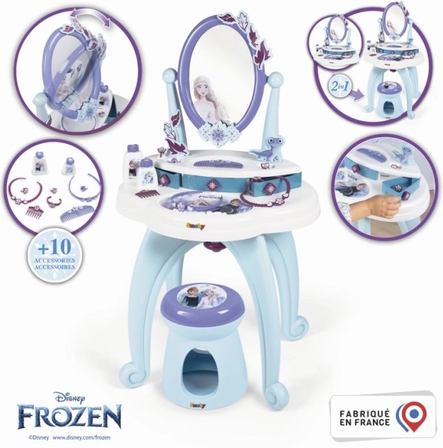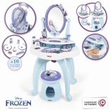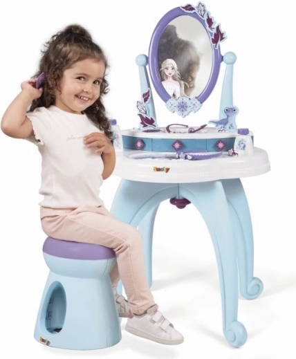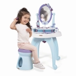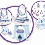 Toaletka 2w1 inspirowana Królestwem Lodu oferuje wszystko, czego potrzebują małe księżniczki do codziennej pielęgnacji. Zawiera duże obrotowe lustro oraz bogate akcesoria, takie jak perfumy i inne kosmetyczne dodatki.