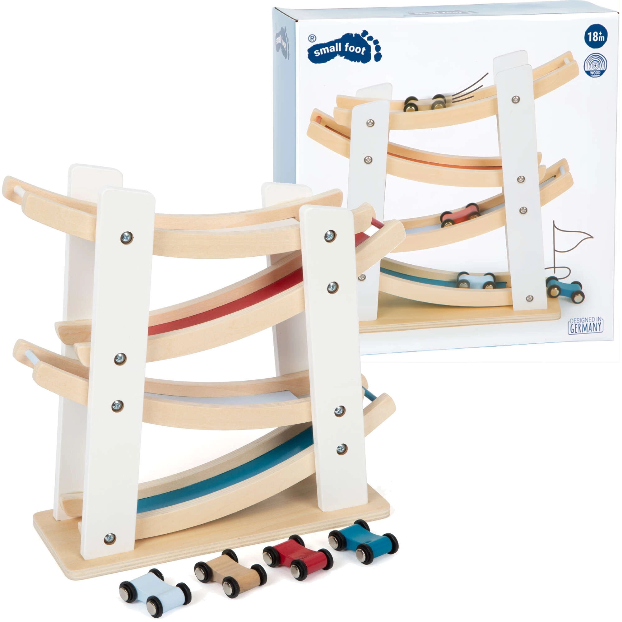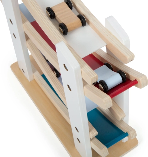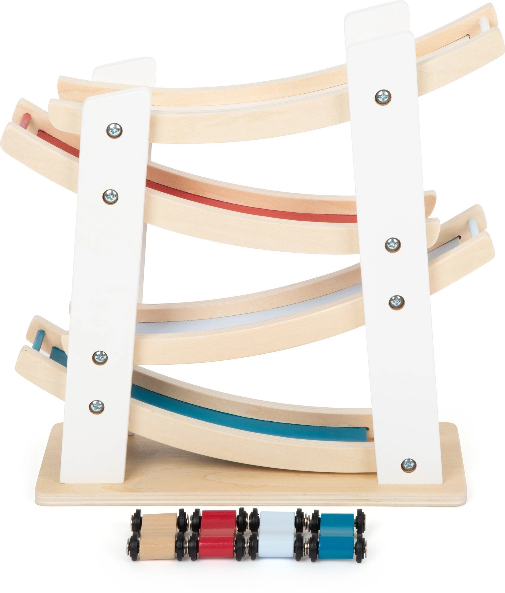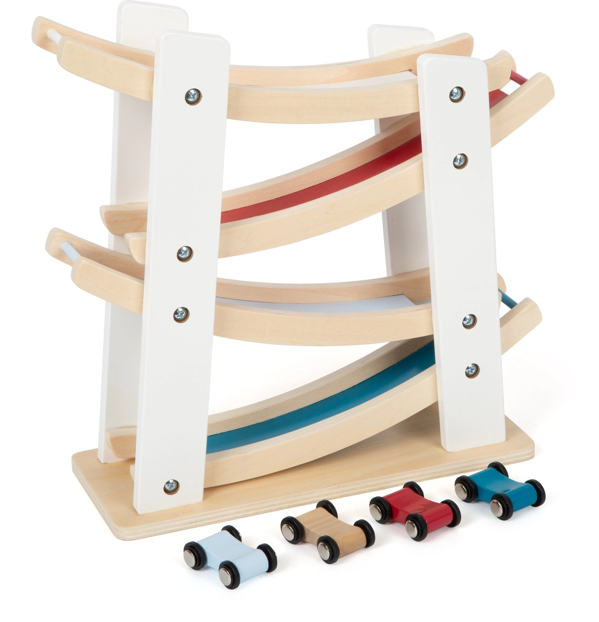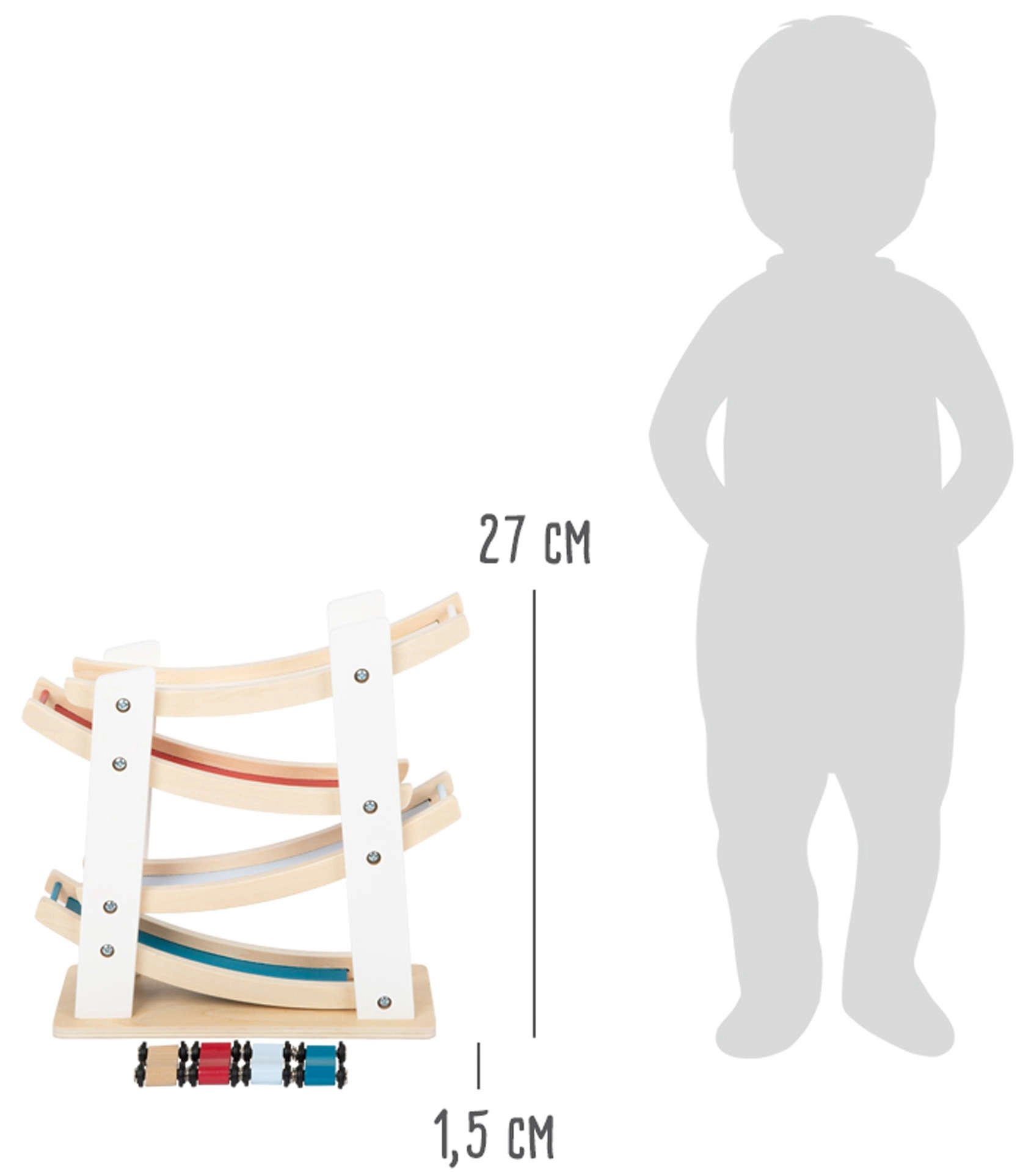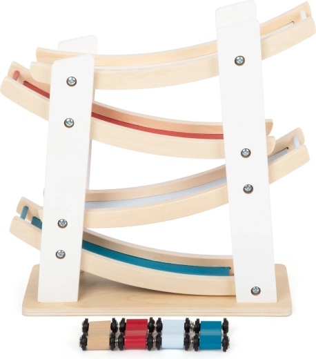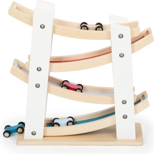 Ten wysokiej jakości drewniany tor oferuje prostą zasadę, którą dzieci uwielbiają: połóż autko na najwyższym poziomie i obserwuj, jak żwawo sunie po zakrzywionych rampach aż na dół. Stabilna podstawa i gładkie powierzchnie gwarantują bezpieczne i długotrwałe użytkowanie.