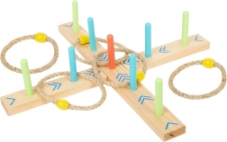 Rzucanie kółkami to wesoła rodzinna gra, która rozwija zręczność i koordynację. Podstawa wykonana jest z 100% certyfikowanego drewna FSC®, co gwarantuje zrównoważone i ekologiczne pochodzenie surowców. Dzięki kolorowym strzałkom na podstawie dzieci mogą łatwo policzyć wynik, bez znajomości liczb. W zestawie znajduje się także podręczny bawełniany woreczek do łatwego przechowywania.