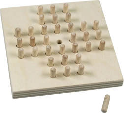 Drewniany solitaire Detoa oferuje sprytną rozrywkę w kompaktowej formie. Gra zaczyna się od usunięcia środkowego kołeczka i polega na przeskakiwaniu sąsiednich kołeczków poziomo lub pionowo. Każdy przeskoczony kołeczek zostaje zdjęty z planszy – planuj ruchy z wyprzedzeniem i spróbuj zostawić na końcu tylko jeden.
