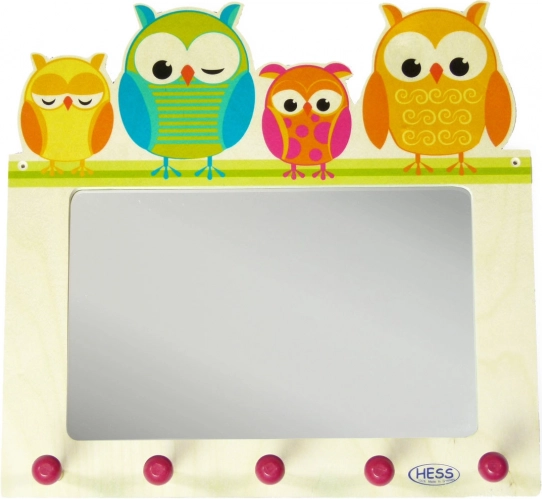 Ten kolorowy wieszak ozdobiony motywem sowiej rodziny rozświetli każdy pokój dziecięcy lub korytarz. Wyposażony jest w pięć haczyków, które zapewniają wystarczająco dużo miejsca na zawieszenie różnych ubrań i akcesoriów. Lustro wykonane z nietłukącego plexiglasu jest bezpieczne i praktyczne.