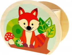 Kolorowa drewniana skarbonka. Główne cechy: z zamkiem i kluczykiem, wykonana z surowego, nieimpregnowanego drewna, w 100% wyprodukowana w Niemczech