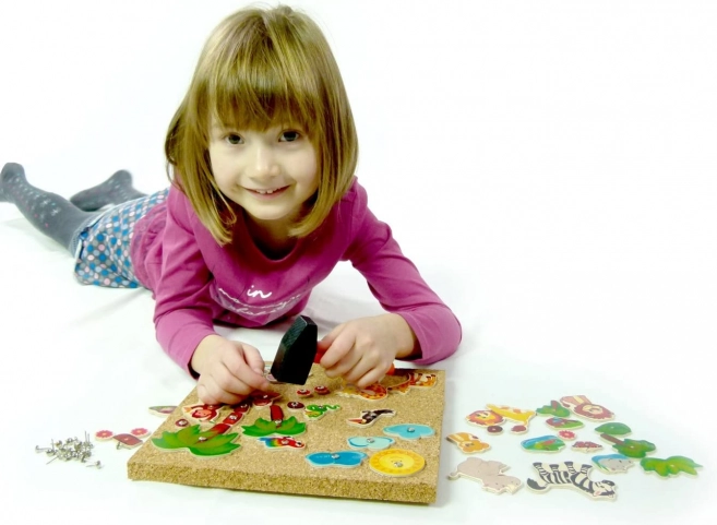Ta wysokiej jakości drewniana gra do wbijania zapewnia dzieciom godziny wartościowej zabawy. Dzięki różnorodnym kształtom z drukowanej sklejki mali twórcy mogą tworzyć własne sceny safari, rozwijać kreatywność i logiczne myślenie. Korkowa podkładka zapewnia bezpieczne i wygodne wbijanie, a duże półokrągłe główki gwoździków ułatwiają manipulację.