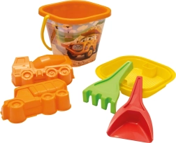 Wiaderko, łopatka, grabki, sitko, 2 foremki (ciężarówka, betoniarka)