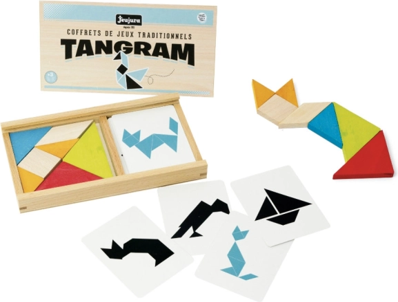 Jeujura tangram: 7 drewnianych elementów, 30 szablonów, ekologiczne farby, drewniane pudełko. Wysokiej jakości zabawka z Francji dla dzieci od 3 lat. Rozwija logikę i kreatywność.
