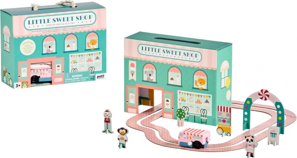 Zafunduj dzieciom słodką przygodę z zestawem do zabawy cukiernia marki PETIT COLLAGE. Dwustronna cukiernia, drewniany nakręcany samochód z lodami oraz łatwa do złożenia trasa z 8 elementów zapewnią godziny kreatywnej zabawy. Zestaw jest bez plastikowego opakowania, wykonany z materiałów z certyfikatem FSC, a dzięki linowemu uchwytowi łatwo go przenosić – idealny do domu i w podróż.
