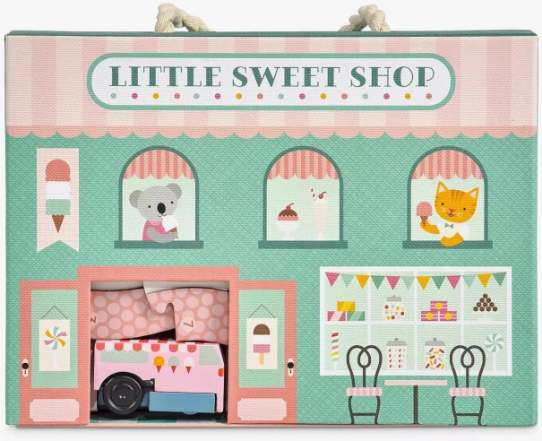 - Zawartość zestawu: dwustronna cukiernia, drewniany nakręcany samochód z lodami, 8 szt. toru, 10 szt. dodatkowych elementów do zabawy