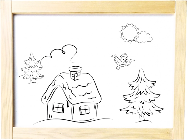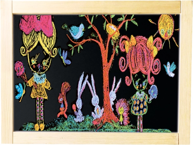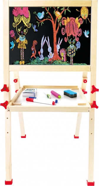 W zestawie znajduje się wszystko, co potrzebne: kreda, marker, gąbka oraz kilka magnetycznych obrazków. Tablicę można szybko złożyć i oszczędnie przechowywać, więc nie zajmuje wiele miejsca. Dwie powierzchnie robocze umożliwiają, by dwoje dzieci tworzyło jednocześnie.