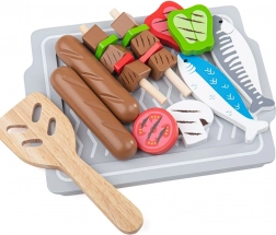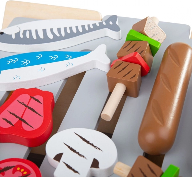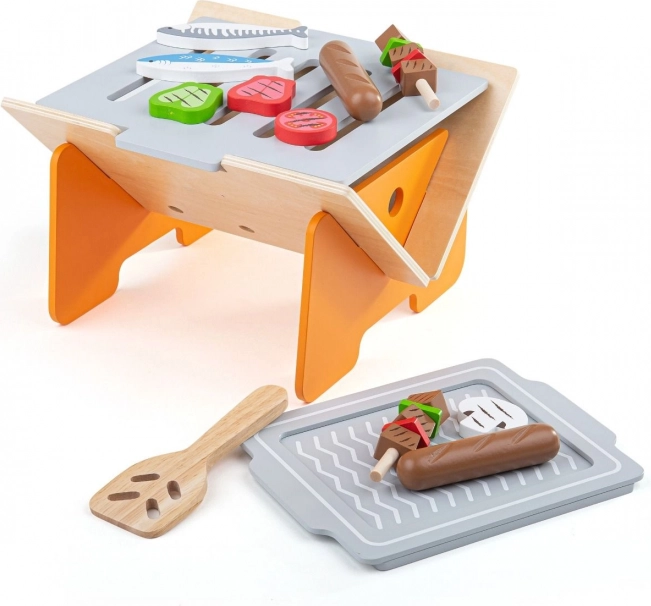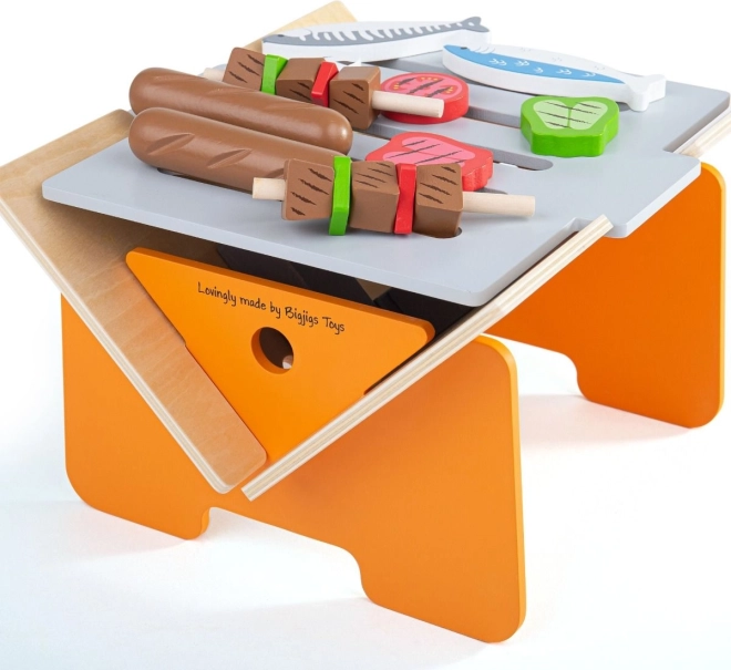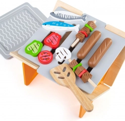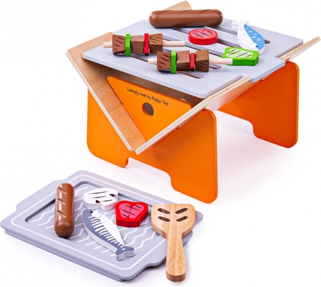Zorganizuj ogrodowe przyjęcie z drewnianym grillem stołowym od Bigjigs Toys! Zawiera 10 sztuk jedzenia, łopatkę, tacę i węgle. Łatwy montaż bez śrubek. Wykonany z materiałów zrównoważonych.