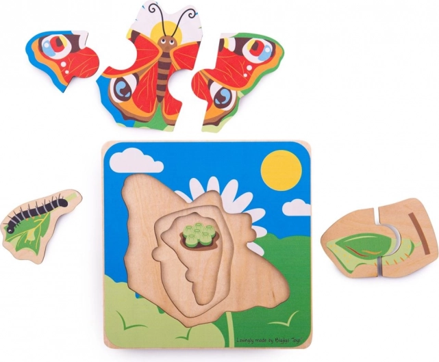 Odkryj zabawną i edukacyjną drewnianą układankę, która w obrazowy sposób pokazuje dzieciom cykl życiowy motyla. Cztery warstwy, od gąsienicy po dorosłego motyla, rozwijają myślenie logiczne, małą motorykę i cierpliwość. Wykonana z zrównoważonych materiałów i spełnia europejskie normy bezpieczeństwa.